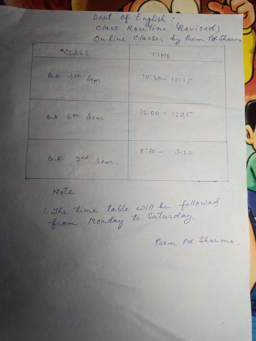 | PREM PRASAD SHARMA | TDC 3RD YEAR(5TH SEM, 6TH SEM) ARTS | English | ENGM 602 - Song of Myself | View |